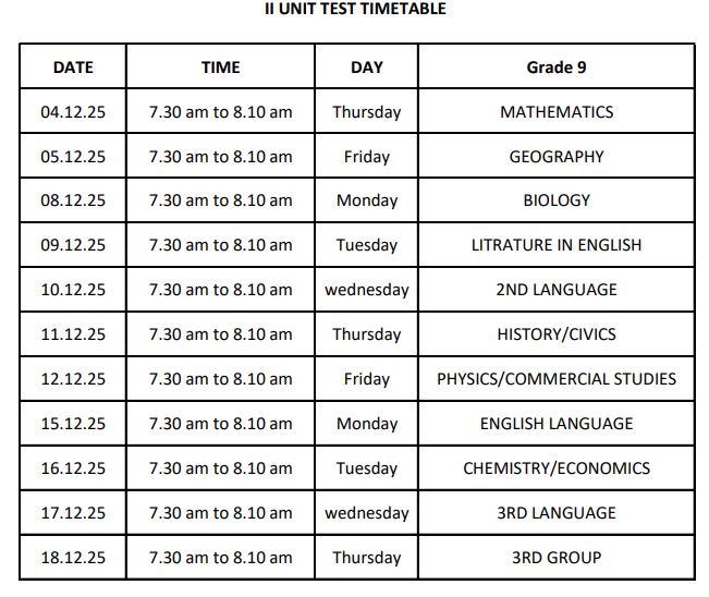 II UNIT TEST SCHEDULE GRADE 9 (2025-26)